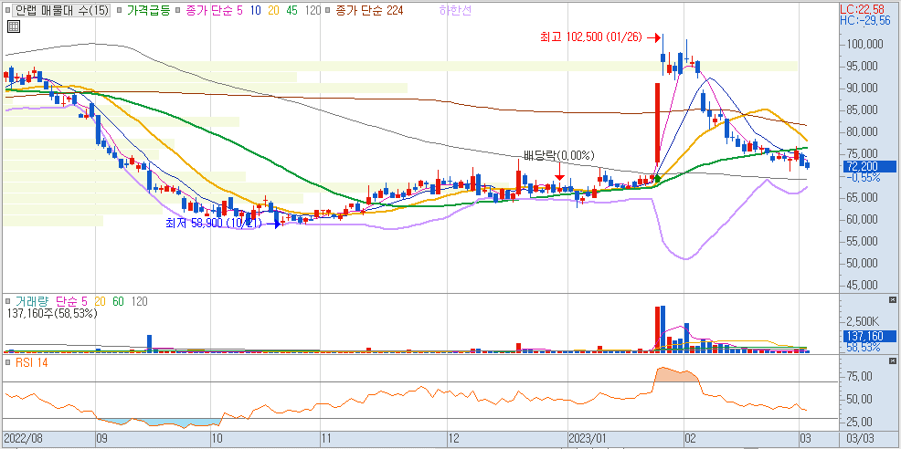 2023/03/03 종가 기준, 2022/11/04 대비 코스닥지수 회전율: 15.64%, 안철수연구소 회전율: 18.17%