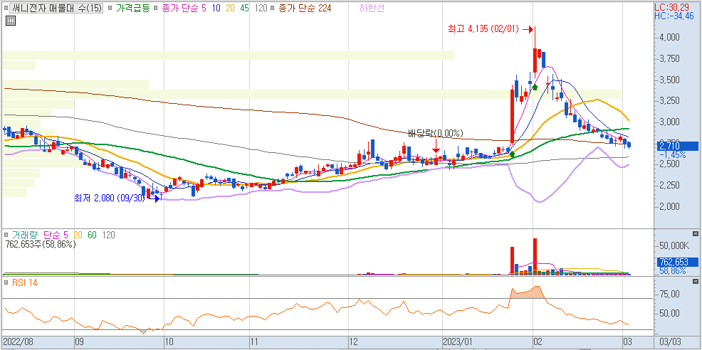 2023년 3월 3일 종가 기준 2023년 1월 2일 대비 KOSPI 지수 변동률: 9.27%, 써니전자 변동률: 5.86%
