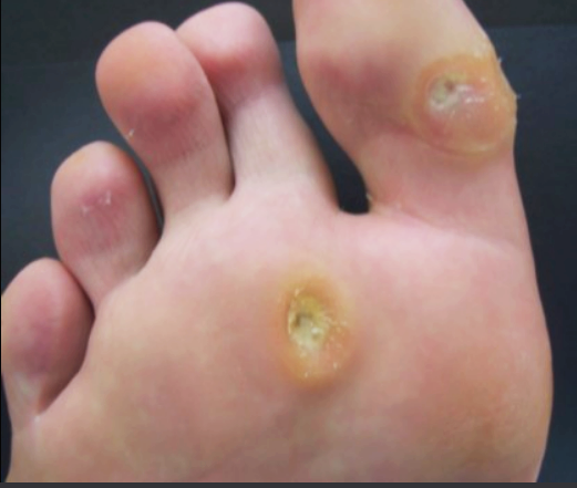 피부의 지속적인 압박이나 마찰에 의해 피부가 두꺼워지고 굳어지는 현상, 즉 굳은살이 생기고, 위에서 누르면 통증이 생기고, 걷기가 힘든 현상을 말합니다.