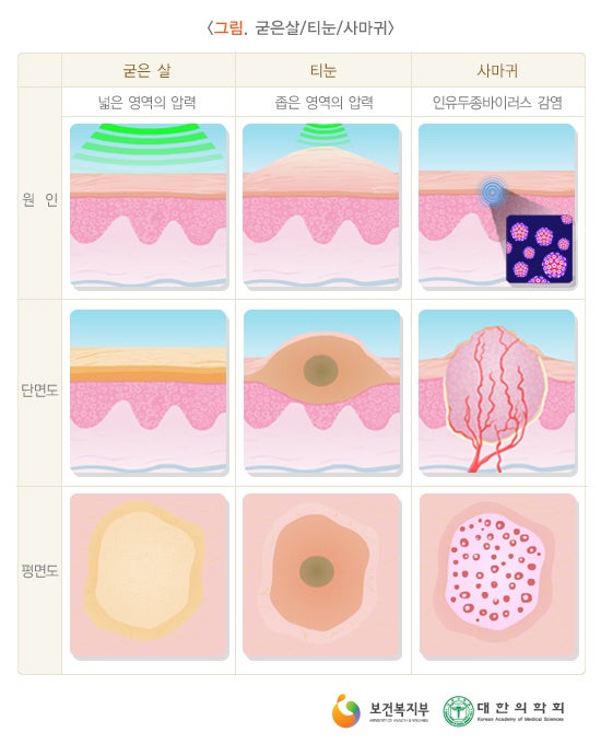 티눈은 피부에 반복적인 압력이나 마찰이 가해져 발생하는 것으로 넓은 면적에 나타나면 티눈, 국소적으로 집중되면 티눈입니다.