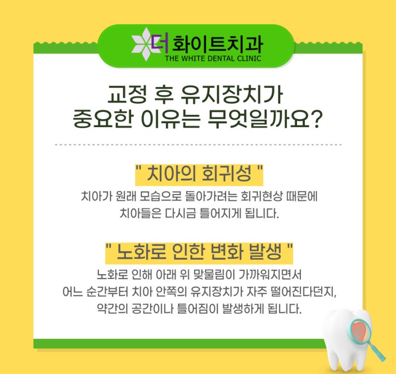 교정 치료를 통해 이동한 치아와 잇몸은 교정 장치를 제거한 후 제자리에 자리잡는 데 최소 6개월이 걸립니다. 이 기간 동안 유지 장치를 제대로 착용하지 않으면 충치로 인해 충치가 발생할 수 있습니다. 원래 위치로 돌아갑니다. 또는 치아를 재배치해야 하는 상황이 발생할 수 있습니다. 6개월이 지나도 교정치료 후 약 1~2년 사이에 이런 현상이 나타날 수 있어 최소 1년에서 최대 5년까지는 유지장치를 착용해야 합니다. . 유지장치를 제대로 착용하지 못하기 때문에 교정치료 후 유지장치를 올바르게 착용하는 것이 좋은 결과를 얻는데 중요합니다. 희망